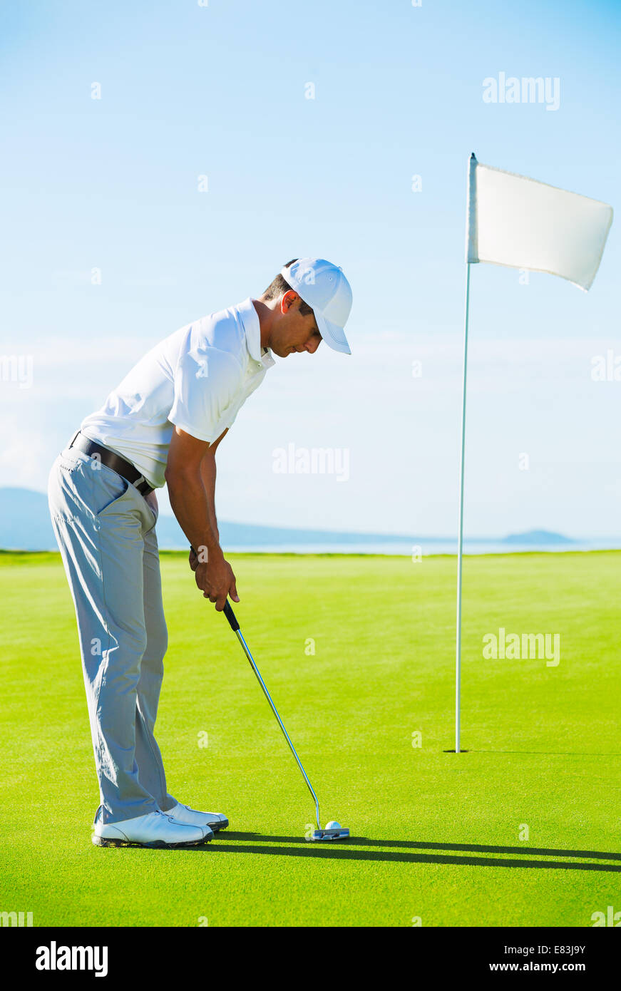 Golfer On Putting Green Hitting Golf Ball Into The Hole Stock Photo Alamy